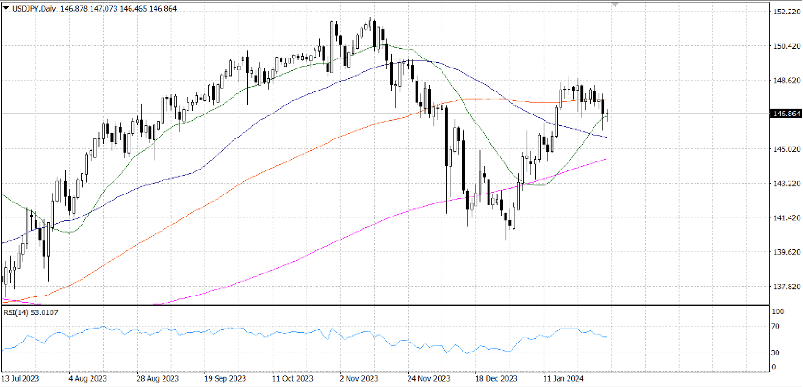 The USD/JPY pair is being undermined by a number of factors, including Retail Sales and Industrial Production, which were released this Wednesday. Aside from this, the USD/JPY pair benefits from the beginning of some US Dollar purchasing, which is encouraged by the decreasing likelihood of a more aggressive Fed policy easing in 2024. The Bank of Japan's hawkish stance, ongoing concerns about a further escalation of geopolitical tensions in the Middle East, and China's economic difficulties, however, counteract the supporting factor and provide some support for the safe-haven JPY.