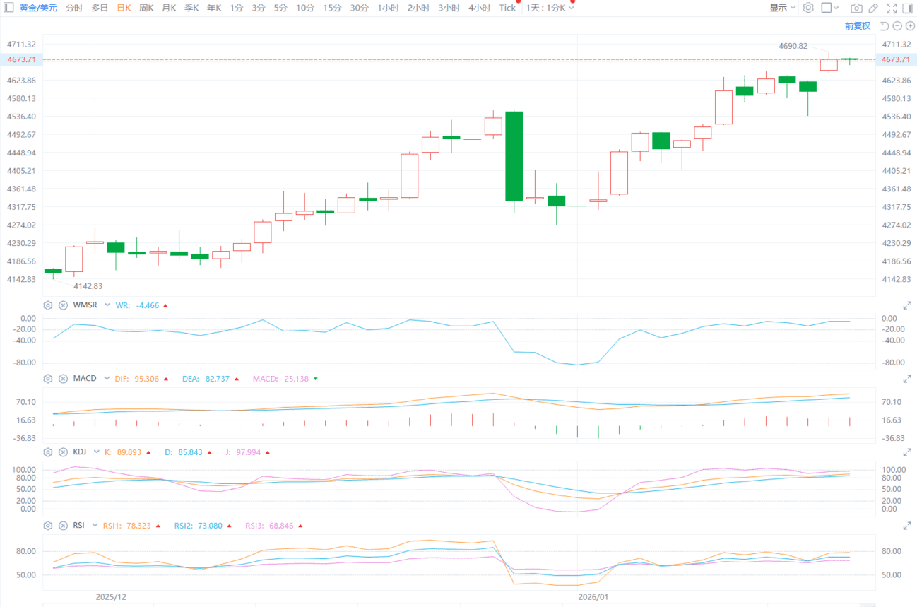 According to ETO Markets monitoring, on January 19 (Monday), spot gold rallied sharply as risk-off flows accelerated on renewed tariff and geopolitical uncertainty. Prices set a fresh record intraday at USD 4,690.46 per ounce. Gold closed up about 1.7% at USD 4,672.49 per ounce, marking a strong one-day move.