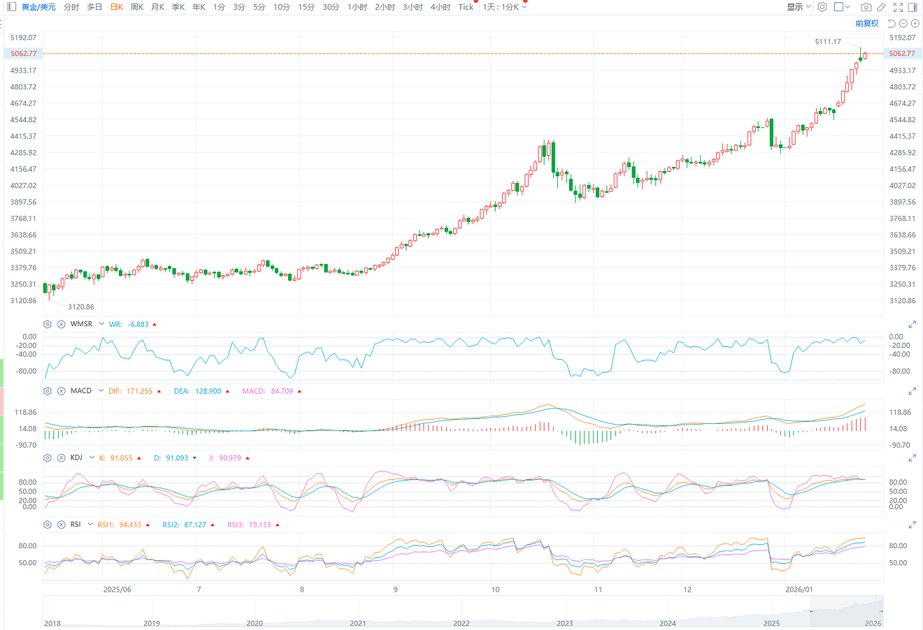 According to ETO Markets monitoring, on January 26 (Monday), spot gold surged on safe-haven demand. Prices broke above USD 5,100 per ounce and hit an intraday high of USD 5,110.86. Gold closed up around 2% at USD 5,077.22 per ounce.
