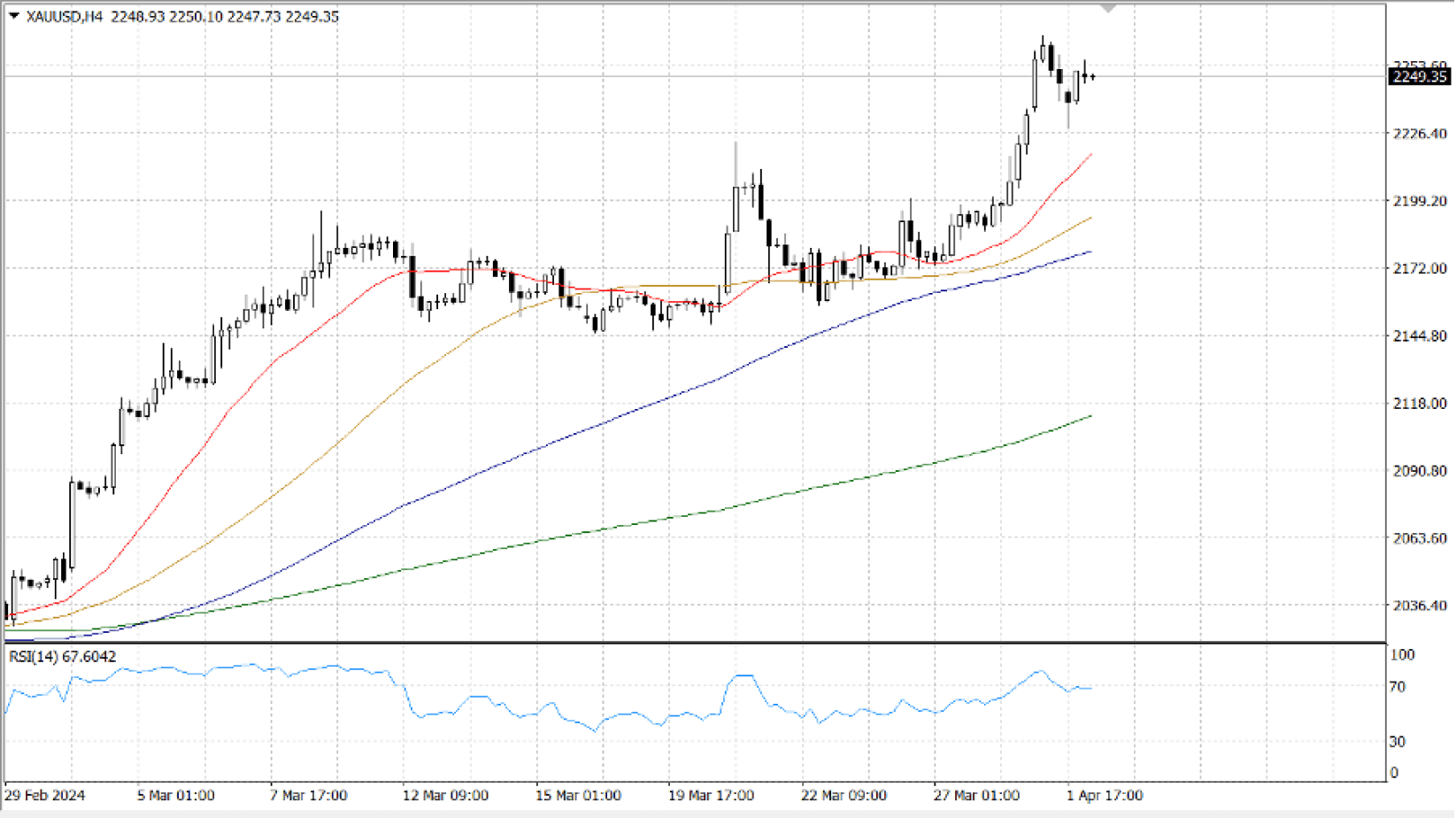 XAU/USD currently trades around $2,250, as the US Dollar gathered momentum following the release of a much-better-than-anticipated US ISM Manufacturing PMI. The report showed that economic activity in the manufacturing sector expanded in March after contracting for 16 consecutive months, with the index jumping to 50.3 from 47.8 in February.