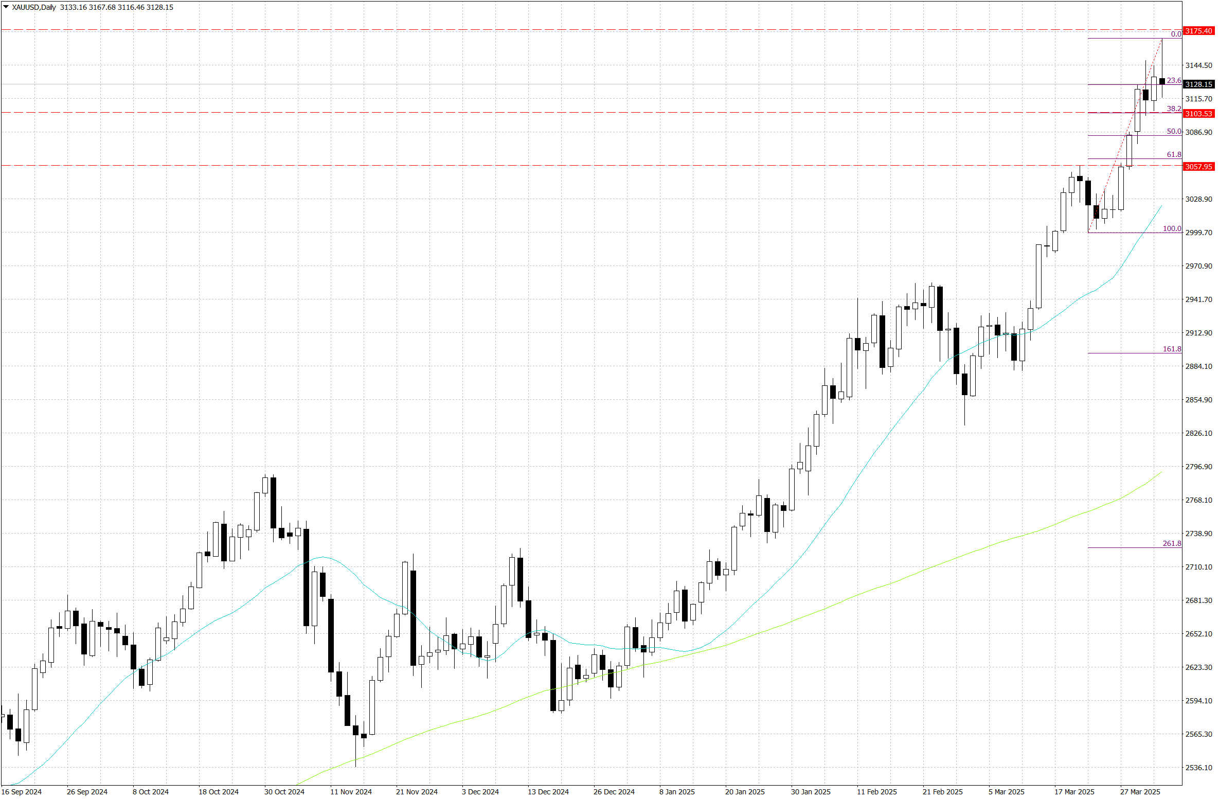 Gold prices are experiencing a significant pullback as global markets react to the implementation of the United States' reciprocal tariff plan. After touching a fresh record high recently, the precious metal has dropped sharply today, trading around $3,115, as traders take profits amidst the market uncertainty sparked by the trade measures. The immediate catalyst for the sell-off appears to be the tariff enactment, overshadowing gold's traditional safe-haven appeal in a "sell the fact" dynamic. Bearish pressure also stems from the potential for this sharp profit-taking to gather pace, especially given the rapid ascent in recent sessions. However, fundamental support remains underpinned by persistent geopolitical tensions in various global hotspots, continued purchasing by central banks looking to diversify reserves, and the overarching expectation of eventual interest rate cuts by the US Federal Reserve, which typically weakens the US Dollar and lowers the opportunity cost of holding gold. Market sentiment has clearly shifted towards caution, with volatility increasing as participants weigh the potential fallout from the tariffs against these underlying supportive factors.