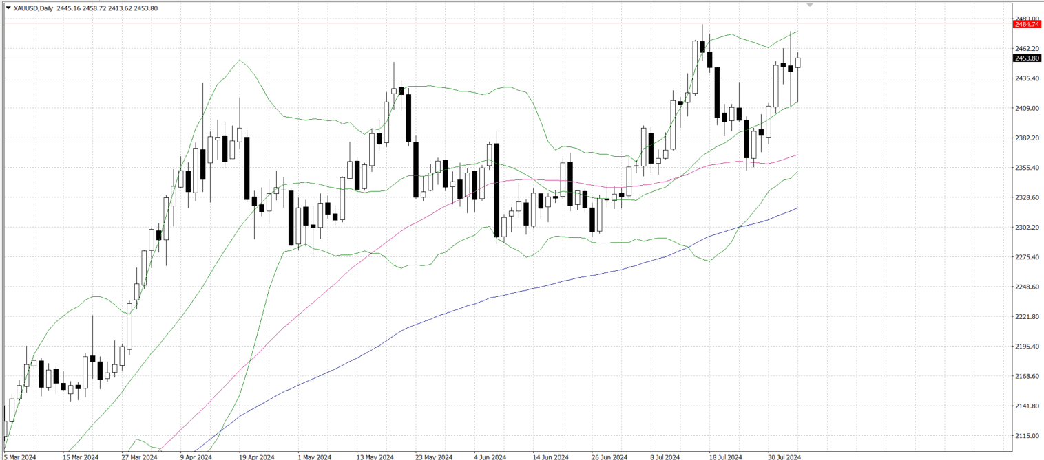Gold prices (XAU/USD) rebounded in the Asian session on Monday, erasing recent losses, supported by a disappointing U.S. jobs report and heightened geopolitical tensions. A weaker dollar and a dovish Fed further boosted gold. In particular, US non-farm payrolls increased by only 114K in July, below expectations of 175K, while the unemployment rate rose to 4.3%, the highest level since November 2021. These factors put the market pricing in a nearly 74% chance that the Fed will cut interest rates by 50 basis points at the September FOMC meeting. In addition, tensions in the Middle East, especially the risk of potential attacks on Israel by Iran and Hezbollah, further stimulated risk aversion and supported gold prices. Looking ahead, investors will focus on Monday's US ISM services PMI data for fresh market catalysts. The services PMI is expected to rise to 51.0 in July from 48.8 in June. If the data is stronger than expected, the dollar could rise, limiting the upside for gold prices.