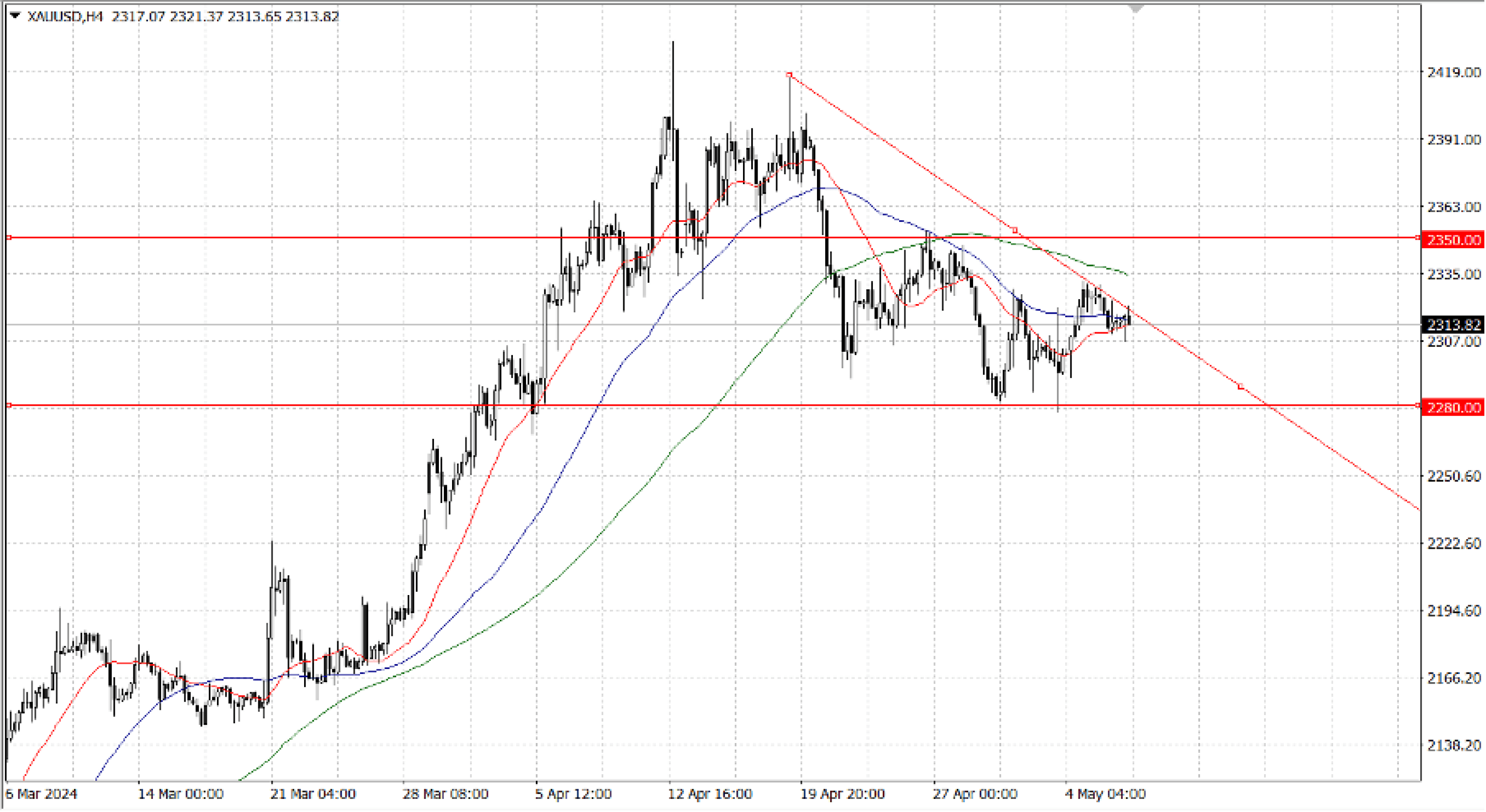 Some buyers are drawn to the gold price. A gold rise may be attributed to demand for safe haven assets, which is being driven by continuous central bank purchases and geopolitical tensions and uncertainties. However, in spite of the less positive than anticipated US employment data in April, the aggressive statements made by Federal Reserve officials may dash expectations for prospective interest rate reductions in 2024. This could therefore cause the price of precious metal to drop.