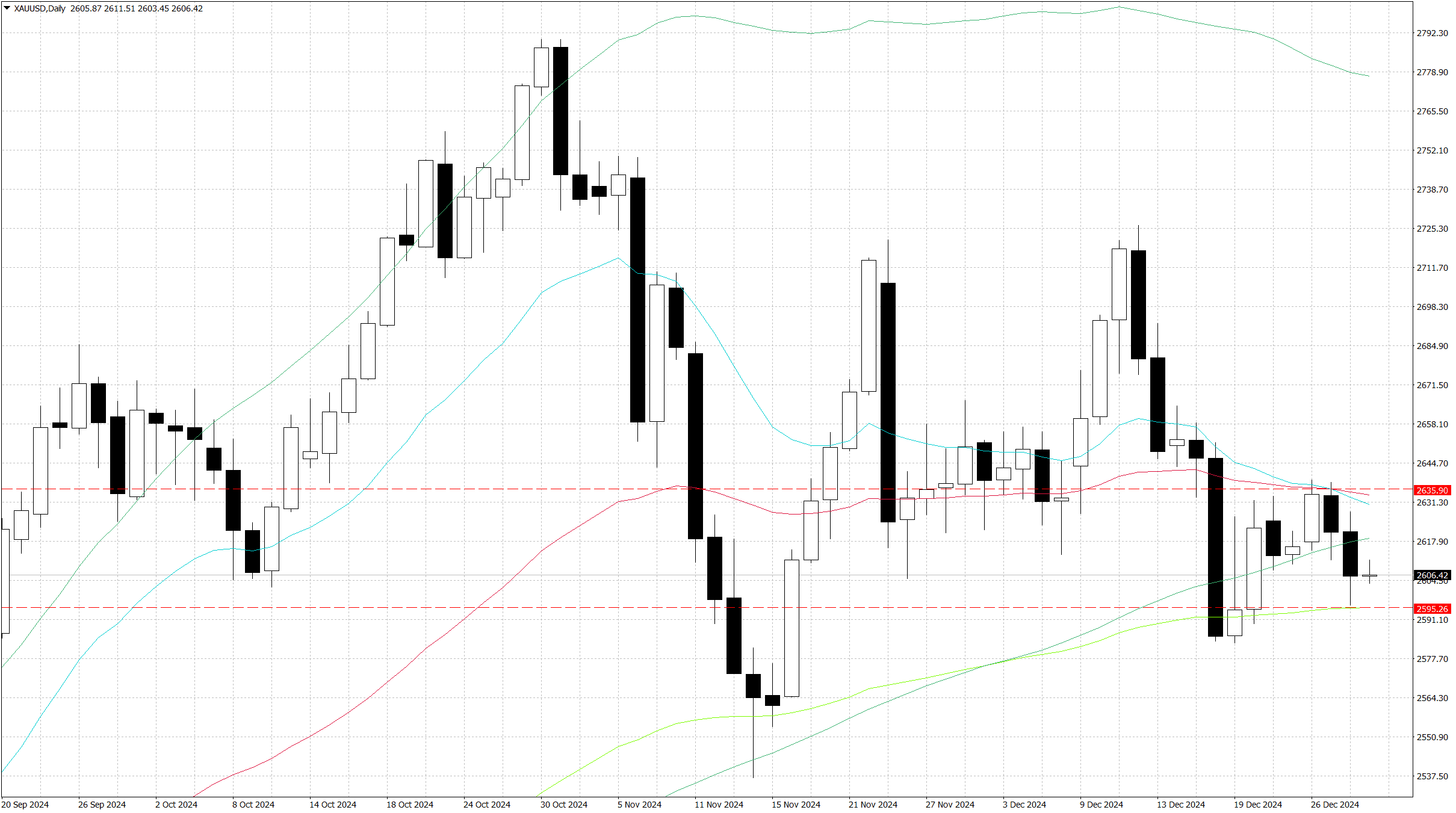 Gold (XAU/USD) enters the final trading session of 2024 at a critical technical juncture, with price action consolidated near $… after an impressive 27% annual gain. The fundamental landscape remains complex, with geopolitical tensions providing underlying support while monetary policy expectations create headwinds. The Russia-Ukraine conflict and Middle East tensions, particularly recent developments involving Houthi militants and Russian security concerns, maintain a steady safe-haven bid. However, the Federal Reserve's hawkish pivot regarding 2025 rate cuts has tempered immediate upside potential. The anticipated transition to the Trump administration introduces additional market uncertainty, particularly regarding potential trade policies that could influence safe-haven demand. The immediate price action suggests a cautious trading environment, with declining volumes characteristic of year-end positioning.