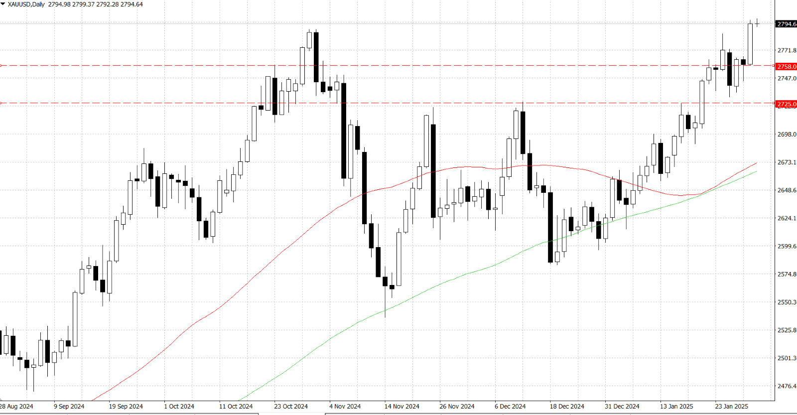 Gold (XAU/USD) consolidates near record highs below $... as investors weigh geopolitical tensions and US President Donald Trump's renewed tariff threats, which could fuel inflation and support demand for the safe-haven metal. However, a hawkish Federal Reserve stance, reinforced by its decision to hold interest rates steady, has lifted US Treasury yields and the US Dollar, capping gold's gains. The latest US GDP data showed a slowdown to 2.3% in Q4, below expectations, further driving gold demand. Meanwhile, traders remain cautious, awaiting the US PCE Price Index for further market direction.