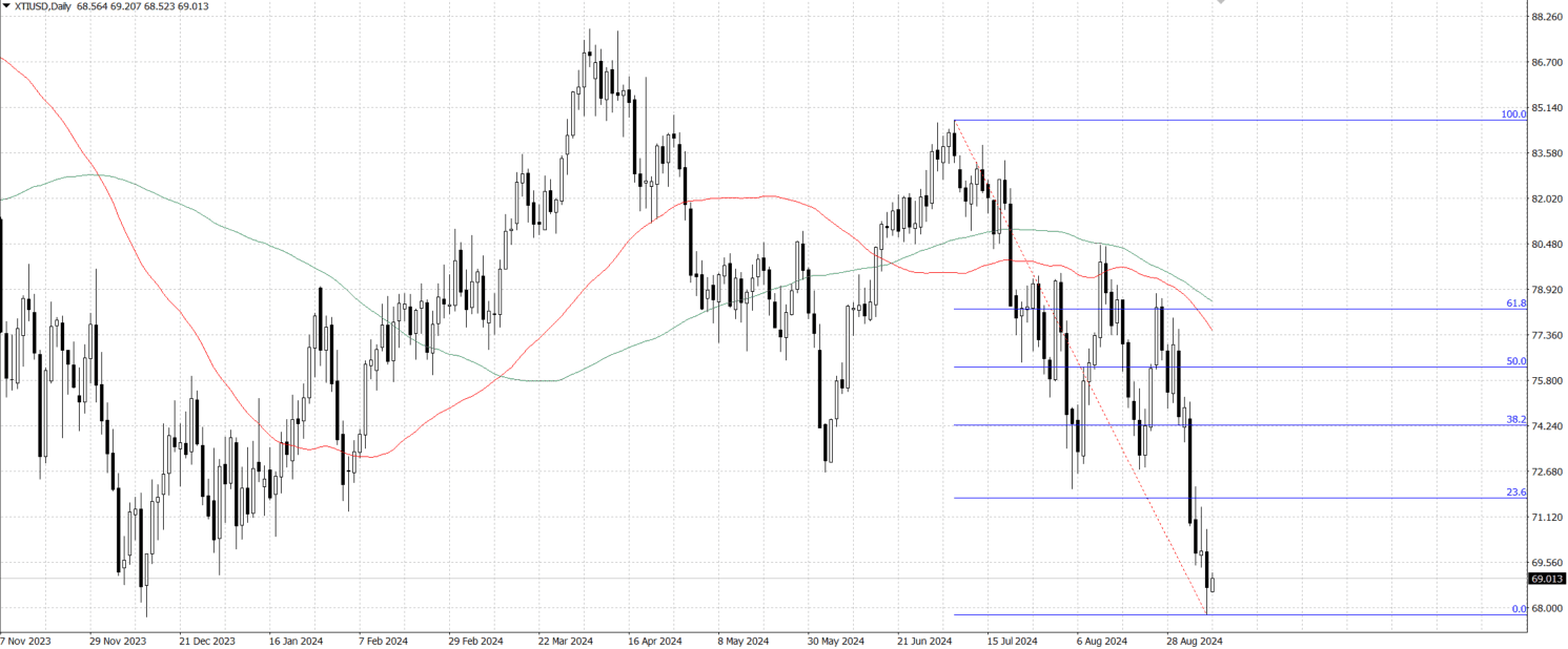 Technically, crude oil prices remain under downward pressure. WTI crude oil prices broke through the August 5 low of $… this week and are currently hovering around $…, showing the risk of further declines. The key support below is at $…, which is the first support area for the market to watch closely. If this support is effectively breached, oil prices could dip further to $…, the low of the June 2023 triple bottom.