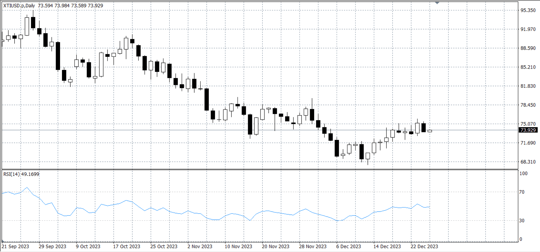 WTI Crude Oil is pausing after a 2% gain last week due to disruptions in Red Sea transportation caused by Houthi rebel attacks on cargo ships in Yemen. Despite ongoing rebel threats, shipping has resumed with a joint task force presence.