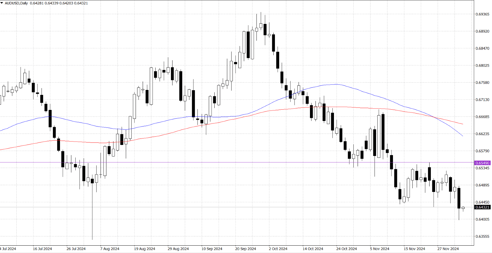 The AUD/USD pair fell over 1% to near …, driven by weaker-than-expected Australian GDP data for Q3, which showed a 0.8% annual expansion, below the 1% growth from the previous quarter and the 1.1% expected. On a quarterly basis, GDP grew by 0.3%, slightly missing the 0.4% forecast. This disappointing data increased expectations that the Reserve Bank of Australia may cut rates as early as April 2025. Additionally, a slight rise in the US Dollar, with the US Dollar Index reaching 106.60, also pressured the Aussie dollar. Meanwhile, the US Institute for Supply Management (ISM) Services PMI fell to 52.1, missing expectations and dropping from October’s 56. Fed Chair Jerome Powell reaffirmed the Federal Reserve's independence, which enjoys support from both political parties, and pointed to a robust US economy with low unemployment and progress on inflation
