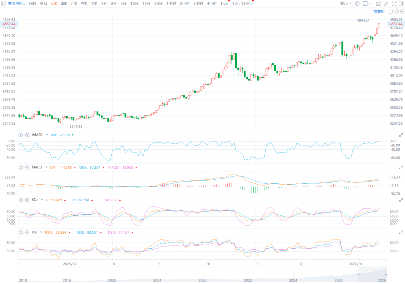 In early Asian trading on January 21 (Wednesday), spot gold extended its rally and printed another record high, briefly reaching USD 4,844.21 per ounce. Prices remain volatile but continue to trade within the upper range.