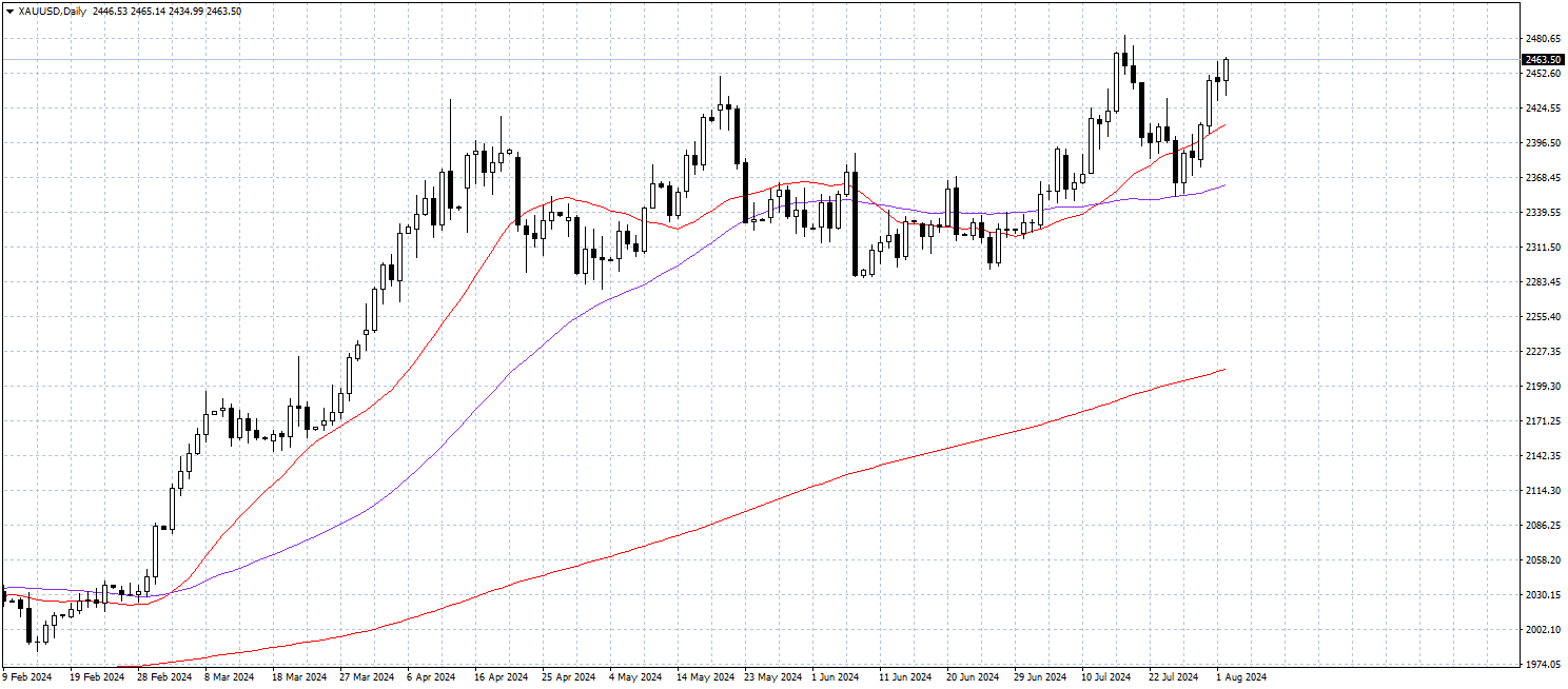 On Friday during the Asian session, the price of gold continued to rise to $2,450 per ounce. Gold investors are filled with concerns about the U.S. employment economic data to be released tonight. The continuous economic weakness has led the market to hold a pessimistic view on key economic data such as U.S. non-farm payrolls and the unemployment rate, boosting safe-haven sentiment and supporting gold prices. Additionally, the escalating geopolitical tensions in the Middle East, following the assassination of a Hamas leader, have further increased the demand for gold. Coupled with dovish remarks from the Federal Reserve (Fed), gold has a good chance of reaching a new historical high.