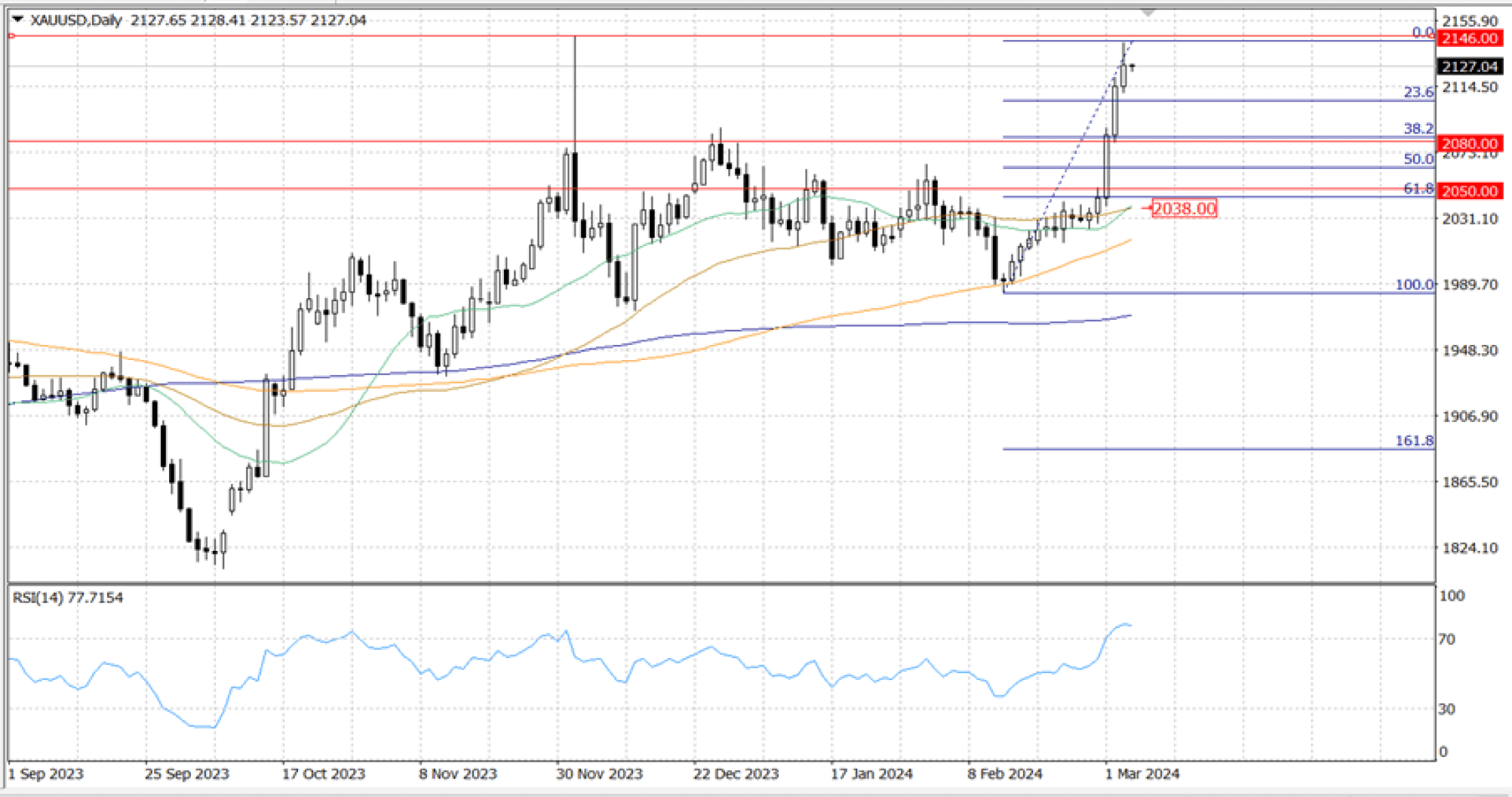 Given that the Relative Strength Index is extremely overbought, a significant correction to the downside may be imminent. The $… support area will be crucial to maintain if that occurs. This level is the 23.6% Fibonacci Retracement of the most recent rally. Acceptance below the latter is probably going to set off another decline into the $… which 38.2% Fibonacci support level locates.