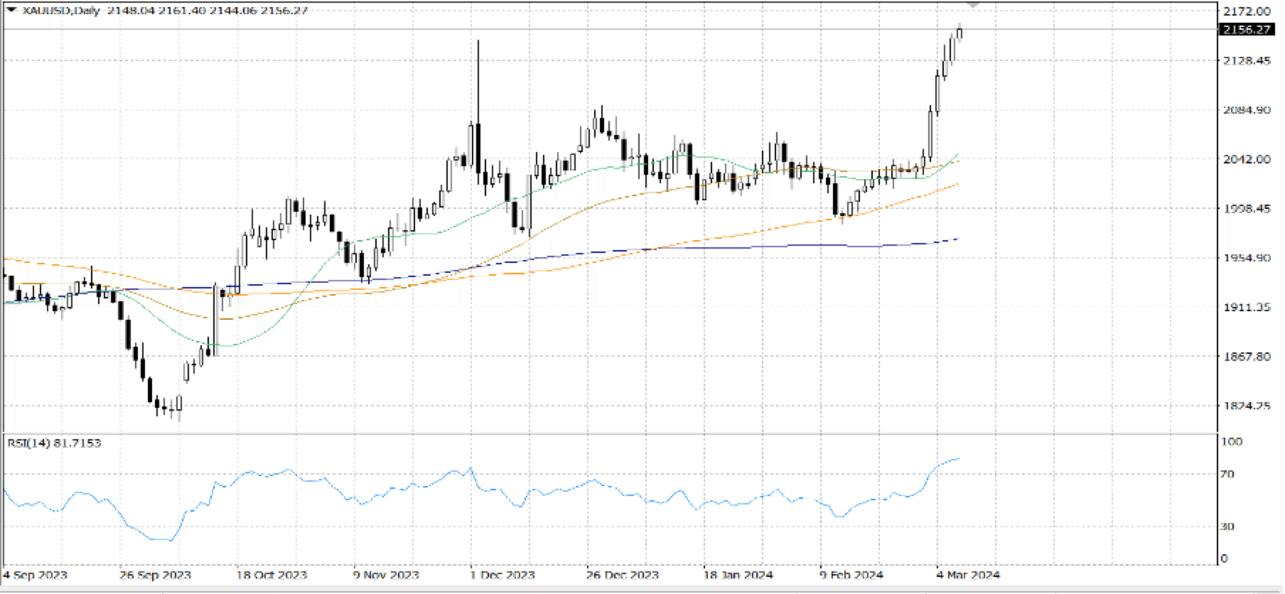 Powell's remarks and the loosening US labour market circumstances contributed to the gold price reaching a new all-time high, but it was only a grind higher. It remains to be seen, though, if the price of gold moves closer to $2,200. Following the recent surge, investors may decide to take profits ahead of Friday's crucial US NFP data release, which could validate the timing of the Fed rate cut as early as June.