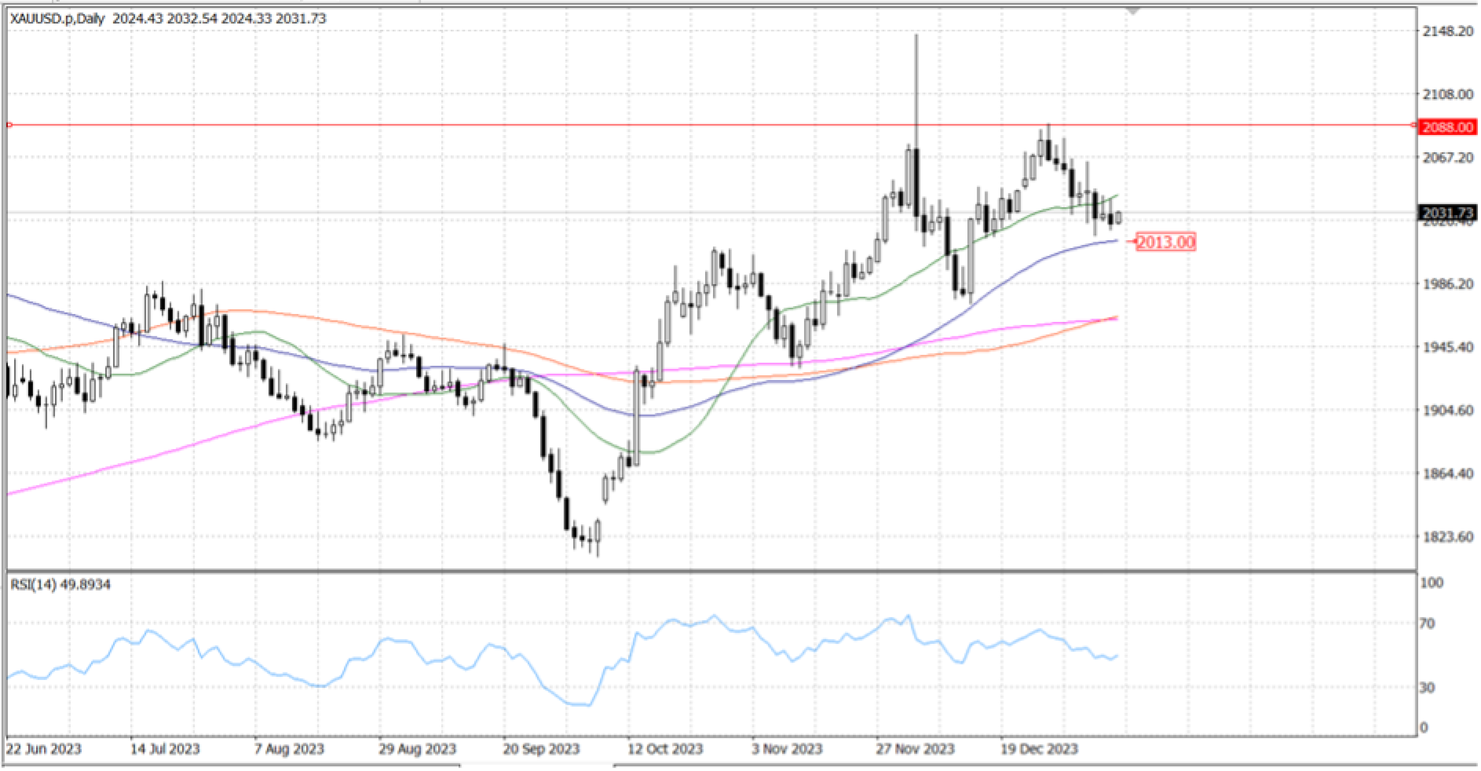 Gold's daily chart indicates a neutral bias in the yellow metal because buyers were unable to break through the most recent cycle high, which was reached on December 28 at $... The short-term trend for XAU/USD is slightly negative, and a decline to test the $… mark may intensify if sellers drive prices below the 50-DMA of $... Alternatively, if buyers enter the market and push prices over $…, that may open the door for a test of the cycle high noted above, which is around $…, before a rebound to $...