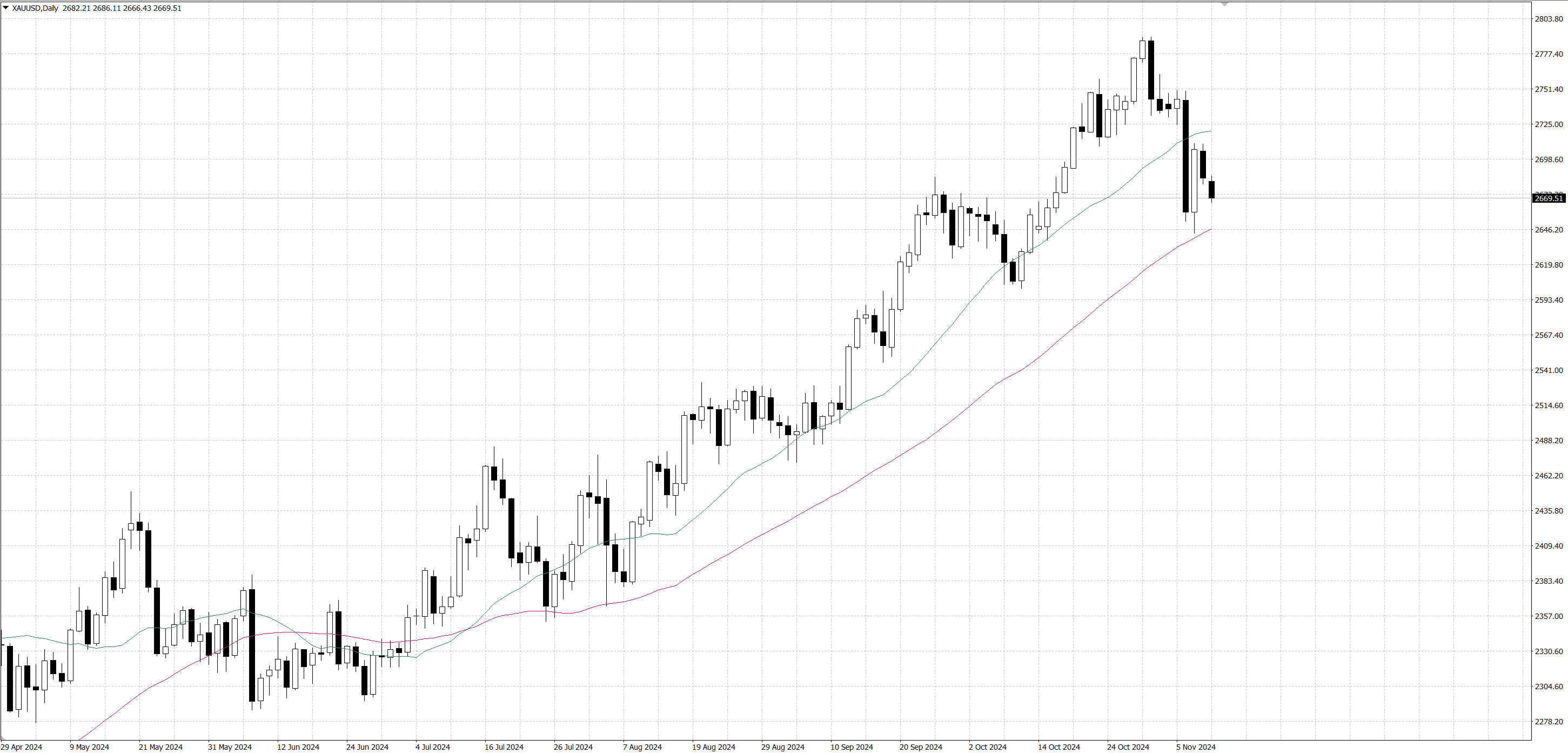 Gold prices fell for the second straight session, weighed down by a stronger dollar and market optimism. Expectations of Trump's expansionary policies after his victory in the presidential election boosted the dollar and weighed on demand for non-yielding assets like gold. Trump's promise to cut corporate taxes further supported risk appetite and weakened gold's appeal as a safe haven asset. In addition, Trump's economic policies are expected to boost growth and inflation, thereby limiting the Fed's ability to cut interest rates more aggressively, causing U.S. Treasury yields to remain high, which puts additional downward pressure on gold prices.