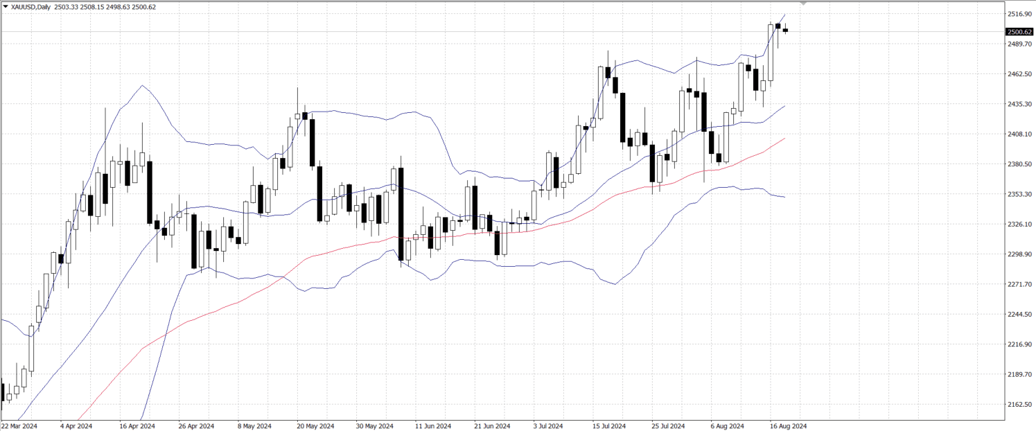 Gold prices remained near the psychological level of $2,500, with the market taking a more cautious stance. Investors are focused on two major events this week - the release of the minutes of the July Fed meeting and Fed Chairman Jerome Powell's speech at the Jackson Hole Symposium. Uncertainty about the Fed's path has led traders to stay on the sidelines, waiting for policy cues before making new bets. Although the dollar recovered slightly from previous lows, dovish Fed expectations and geopolitical tensions, particularly the Middle East conflict and the ongoing Russia-Ukraine war, continued to provide support for gold prices. On the economic front, strong retail sales data last week eased fears of a recession in the United States, leading to reduced bets on more aggressive policy easing by the Federal Reserve. Still, expectations of a quarter-point rate cut by the Fed in September remain high, and some traders believe the Fed could cut rates significantly by the end of 2025. In addition, on the geopolitical front, increased optimism about the negotiations between the United States and the Middle East further limited the gains of gold prices.