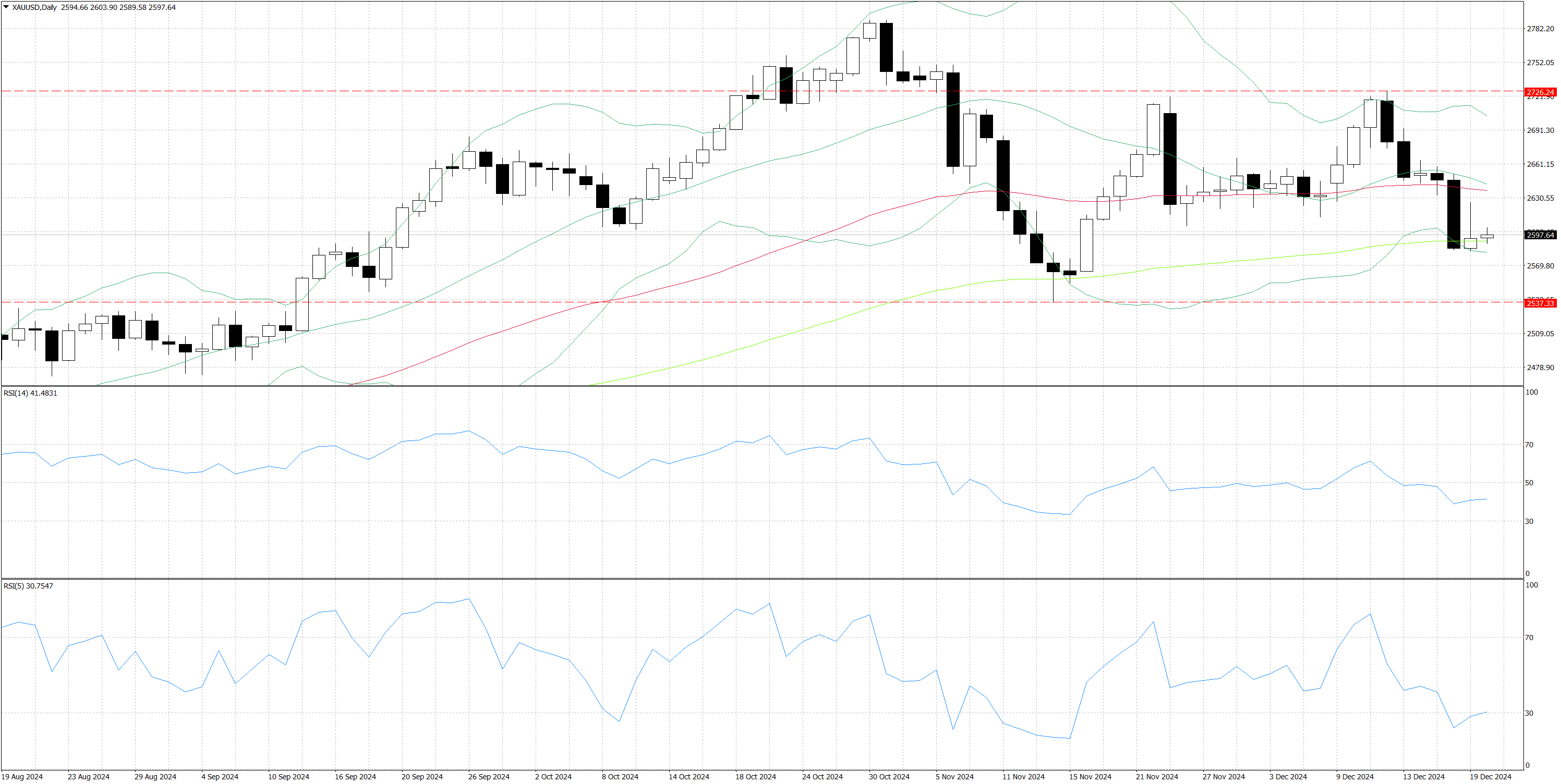 The current fundamental landscape for gold presents a mixed picture but with a slight bearish bias. The Federal Reserve's recent hawkish stance, indicating only two rate cuts in 2025 versus previous expectations of four, has significantly impacted real interest rate expectations. This shift in monetary policy outlook, combined with persistently high bond yields, creates headwinds for the non-yielding metal. However, mounting geopolitical risks, including potential US government shutdown and President-elect Trump's tariff threats, provide notable support through safe-haven demand. The technical indicators and price action suggest increased volatility ahead, with key support levels being tested while upside momentum remains limited. The technical landscape for gold reveals a complex interplay of support and resistance levels that warrant careful attention.