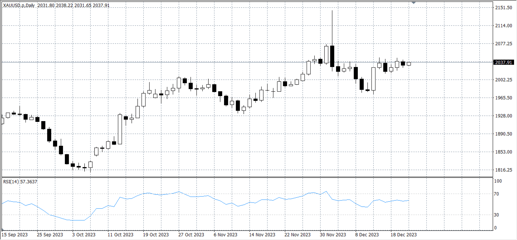 Gold prices saw a slight dip today, staying within Tuesday's trading range. The US Dollar gained strength in the morning, supported further by positive US data released after Wall Street's opening. CB Consumer Confidence for December improved to 110.7, surpassing the forecast of 104.6. As a result, XAU/USD declined from its intraday high of $2,043.57 to around $2,029.46.