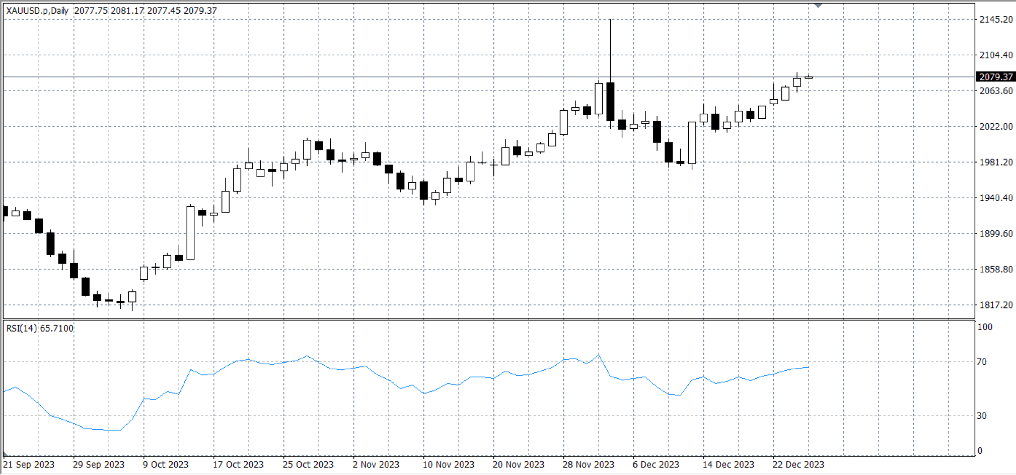 Gold prices (XAU/USD) climbed above $2,070 during the Asian session, propelled by a weaker US Dollar. Currently at $2,080, the metal gained 0.09% for the day.