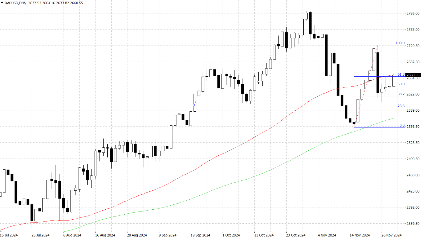 Gold (XAU/USD) spikes to a four-day high around $…-… as geopolitical tensions, trade war fears, and expectations of Federal Reserve rate cuts boost demand for safe-haven assets. The US Dollar struggles near a two-week low due to these factors, although the US PCE data shows stalled inflation, suggesting the Fed may slow its rate cuts, which could support the USD and cap gold's gains. Meanwhile, Russian President Putin threatens to use hypersonic missiles against Ukraine, and US President-elect Trump’s tariff plans on Canada, Mexico, and China raise concerns of trade wars. The Fed is divided on further rate cuts, and the 10-year US Treasury yield hits a two-week low amid hopes of controlling US deficits. With no major economic data expected on Friday and early closures for the Thanksgiving holiday, market uncertainty persists.