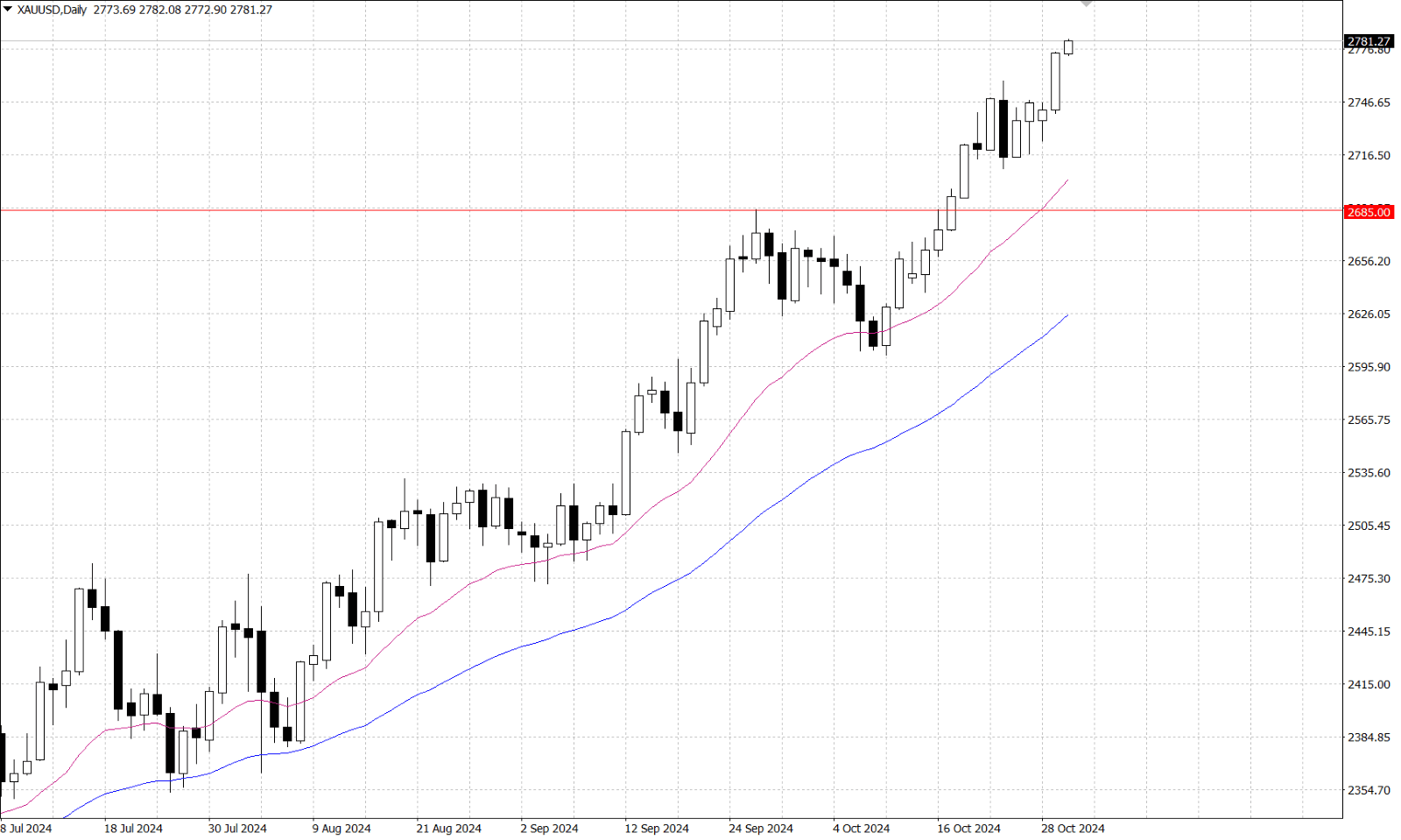 Gold (XAU/USD) continues its bullish momentum, currently trading near $…, marking another significant all-time high (ATH). This rally aligns with easing U.S. Treasury yields and growing expectations that the Federal Reserve may pivot toward rate cuts at its November meeting. Meanwhile, traders are closely watching the uncertainty caused by the upcoming US election, which increases the demand of safe-haven assets. Additionally, mixed U.S. data, weak September JOLTS figures and rising consumer confidence, has also added to market uncertainty. Gold’s ascent is also fuelled by geopolitical tensions, with conflicts in the Middle East, Ukraine, and reports of North Korean troops in Russia contributing to safe-haven demand. With key economic data ahead, including the ADP Employment Report, Nonfarm Payrolls, and Q3 Gross Domestic Product (GDP), market participants remain focused on further developments that could influence the Fed’s policy stance.