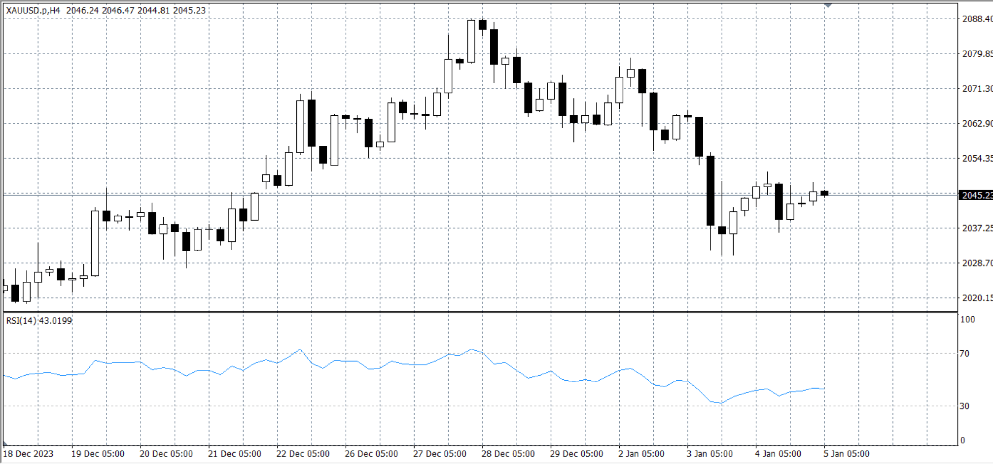 Gold (XAU/USD) is trading around $2,040 with little change on Thursday, adjusting from earlier gains in the American session. The US Dollar faced slight pressure on Wednesday due to mixed data and the Federal Open Market Committee (FOMC) Meeting Minutes. In mid-December, the Federal Reserve (Fed) discussed the possibility of rate cuts, as mentioned by Chair Jerome Powell. However, the Minutes don't provide clarity on when the Fed might take action, only suggesting it could happen in 2024.