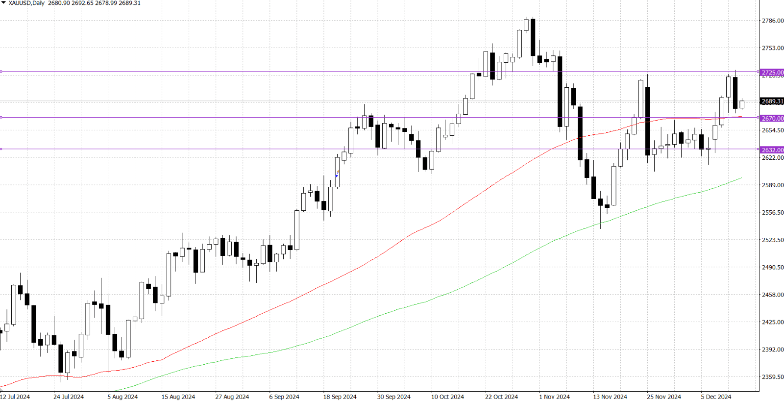 Gold prices (XAU/USD) have regained some positive traction following a profit-taking pullback from a five-week high near $…, although the rally lacks strong follow-through buying. Geopolitical risks, such as the Russia-Ukraine war and tensions in the Middle East, along with concerns over US President-elect Donald Trump's tariff plans, continue to boost safe-haven demand for gold. Additionally, expectations that the Federal Reserve (Fed) will implement a third consecutive rate cut at the end of the December policy meeting provide some support for the non-yielding metal. However, the upside for gold is limited by expectations that the Fed will take a more cautious approach to interest rate cuts, as progress in lowering inflation to its 2% target has stalled. This outlook, combined with rising US Treasury bond yields, strengthens the US Dollar (USD), helping it maintain its gains and capping gold’s price potential. Traders are likely to remain cautious ahead of the upcoming two-day FOMC policy meeting, where further direction on US monetary policy is expected.