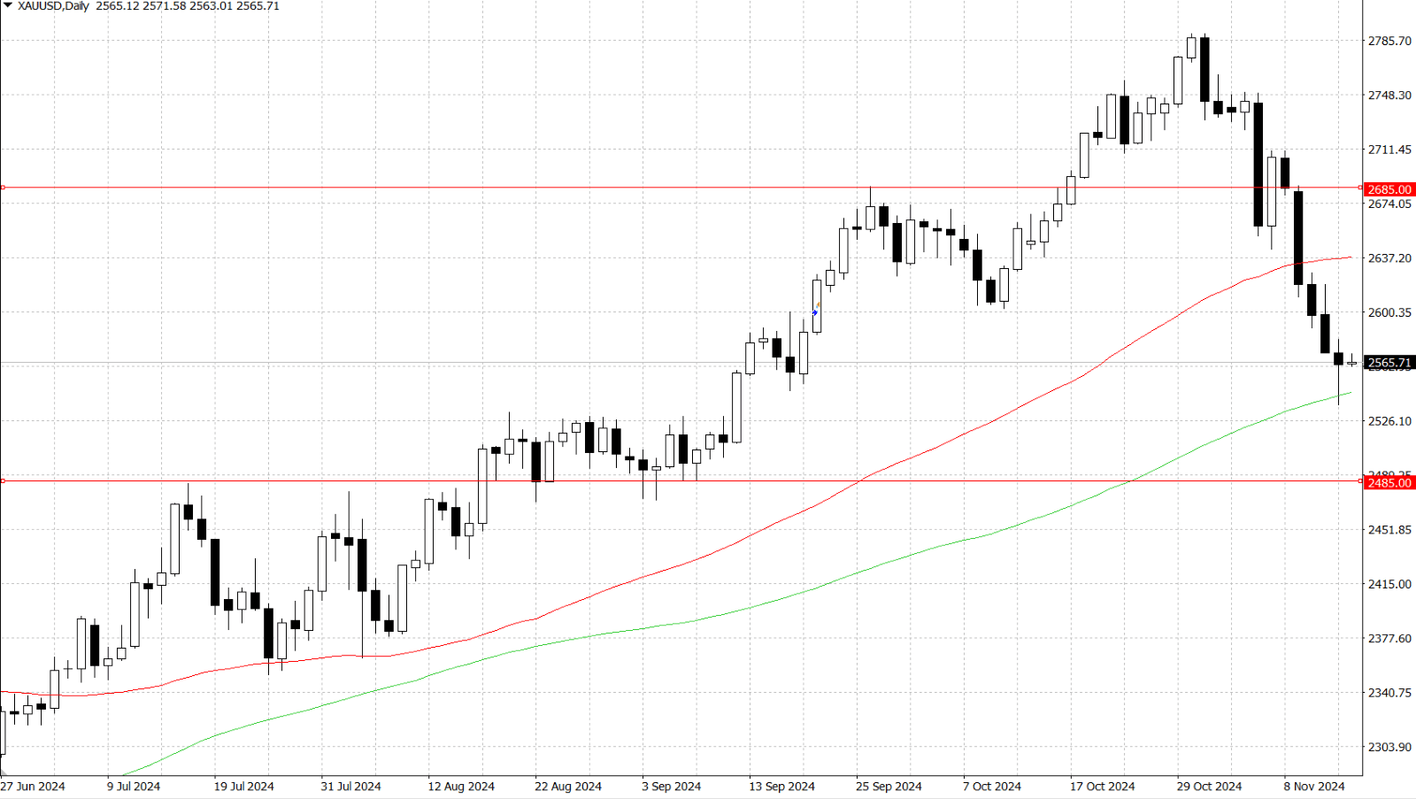 Gold (XAU/USD) has declined nearly 7% in November as markets react to significant political shifts following the re-election of former President Donald Trump. Recent US economic data presented mixed signals: Initial Jobless Claims fell to 217K, better than expected, while the Producer Price Index (PPI) rose 0.2% on a monthly basis and 2.4% for the 12 months ended in October, raising inflation concerns. Monthly wholesale inflation increased by 0.2%, reaching 2.4% year-over-year, with the core PPI annual rate at 3.1%, slightly above forecasts.