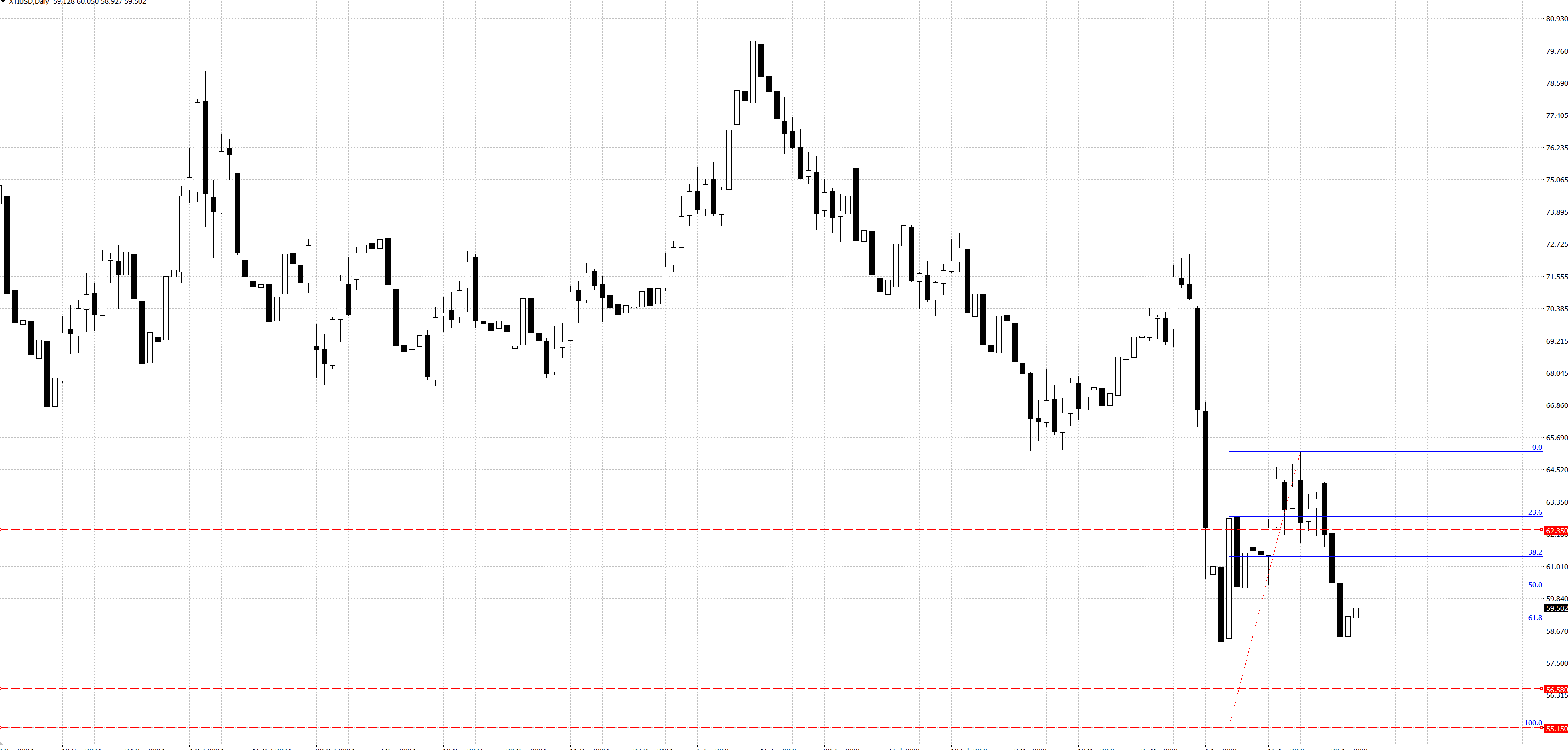 From a technical perspective, a daily close below the newly signaled level would cement a fresh bearish bias for WTI, targeting the $… mark—a key psychological level and the 50 percent retracement of the recent corrective move. A firm break below $… would confirm that the corrective phase has ended and shift the near-term outlook decisively negative. Conversely, if prices fail to breach the $… pivot, immediate downside pressure would ease, preserving the potential for a healthier upside correction—though such a rally would need to clear and close above the resistance at $… to be deemed valid. Conversely, the immediate support level would be at $… as the start point of corrective phase. If the price breaks the level, the price should be targeted to the $…. Technical studies are mixed: the indicator lines remain in bearish alignment, yet momentum readings are strengthening, and the stochastic oscillator hovers at the edge of oversold territory.