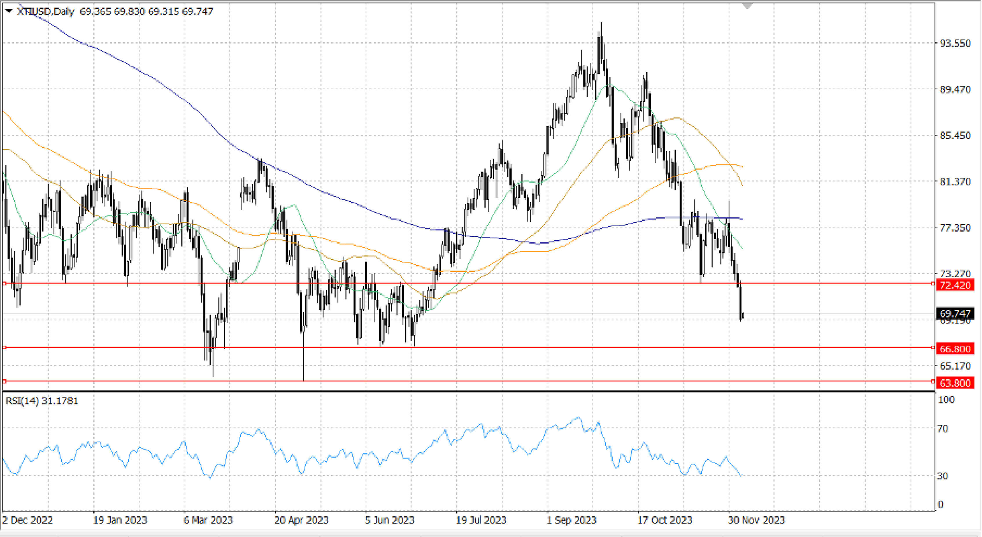 The daily chart shows WTI in a downtrend, fully controlled by bears, having broken through the low of $… from the previous year, which has allowed for additional downward. The next demand area would be the daily low of June 28 at $…, and the most recent swing low, the daily low of June 12 at $... Eliminating those levels will reveal the $… year-to-date low. Conversely, a bounce back over $… might allow for a test of the daily low of $… set on November 16.